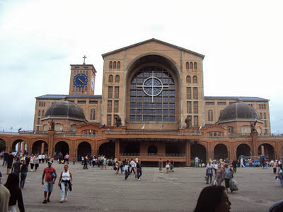 EM MINHA RECENTE VIAGEM À SÃO PAULO, FUI CONHECER A SEGUNDA MAIOR BASÍLICA DO MUNDO,O SANTUÁRIO NACIONAL DE N. SRA. APARECIDA. UMA PONTE RODOVIÁRIA, COM ÔNIBUS DE HORA EM HORA, LIGAM O TERMINAL TIETÊ À APARECIDA DO NORTE (188KM), NO VALE DO RIO PARNÁIBA, JUNTO À VIA DUTRA. CHEGANDO À CIDADE, SOBE-SE A ÍNGREME LADEIRA RODEADA DE LOJAS E HOTÉIS QUE LEVA ATÉ O ALTO DA COLINA -ONDE FICA A BASÍLICA VELHA, CONSTRUÍDA EM 1745 E ATUALMENTE EM REFORMA. DA PRAÇA EM FRENTE SAI A PASSARELA DE CONCRETO QUE LEVA À BASÍLICA NOVA.